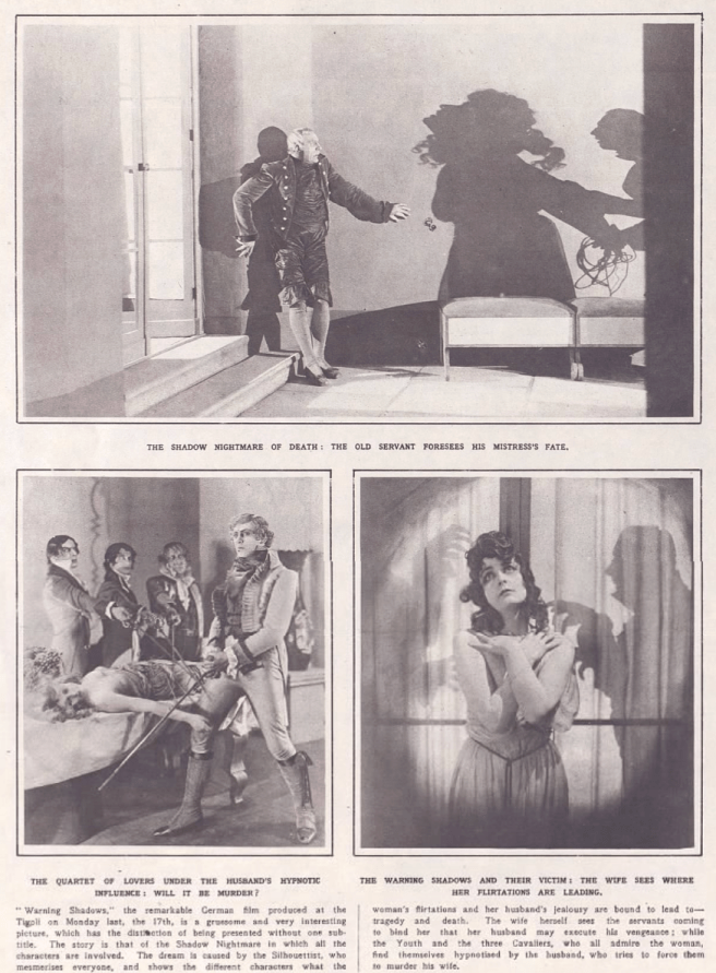 Schatten (dir. Arthur Robison, 1923) begins with a five minute introduction to the film’s players, who are trotted out like the foils in a police lineup onto an actual stage where they’re identified with intertitles. After this lengthy prologue, the film abandons the use of titles altogether and embraces the purely visual ideal of silent films (predating Friedrich Wilhelm Murnauu’s efforts which are usually credited as the first to do the same.)