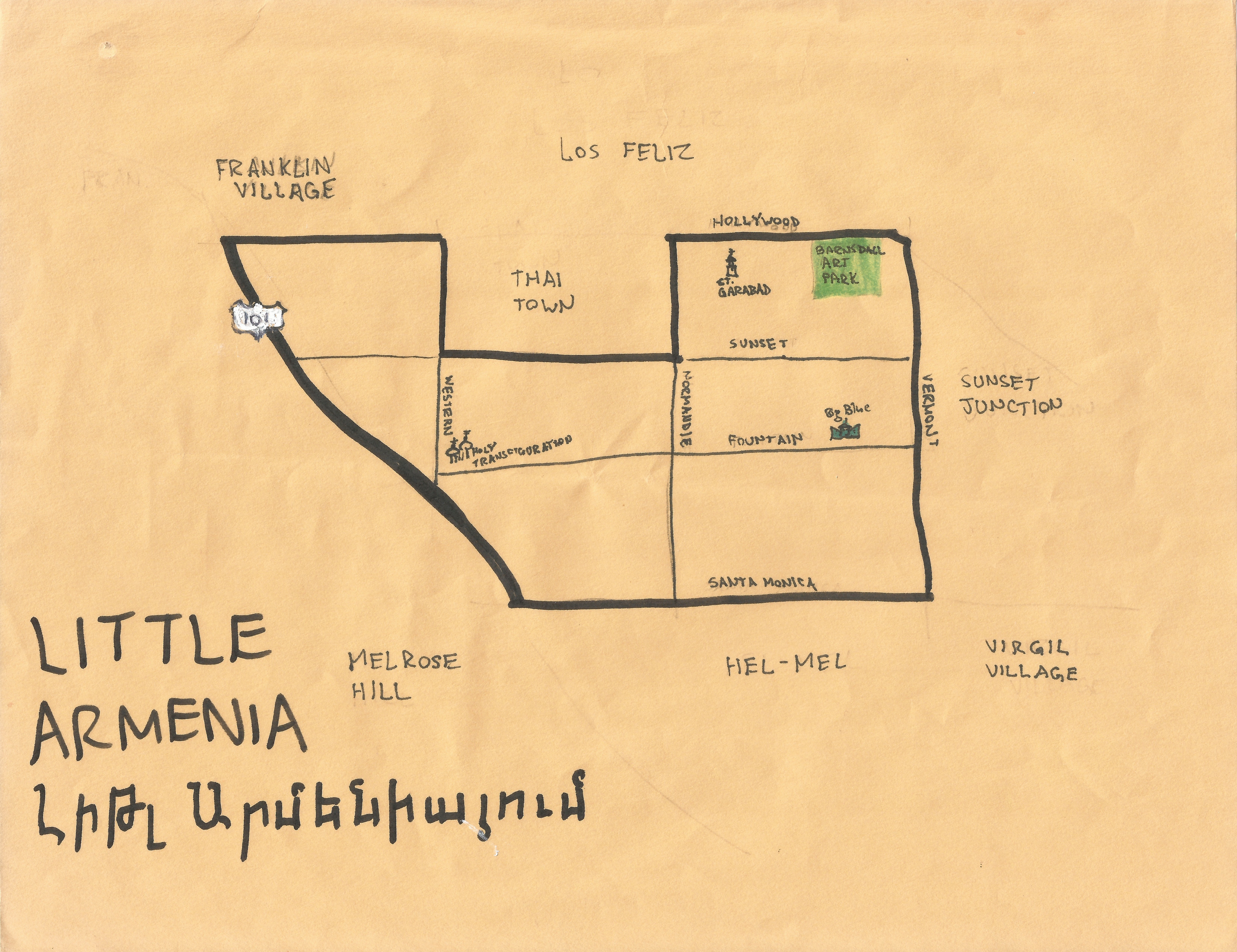 Little Armenia doesn’t really have a downtown. It’s roughly quadrisected by Normandie and Sunset; bordered by Hollywood Boulevard to the north, Santa Monica Boulevard to the south, Vermont to the east, and the 101 Freeway to the west. It is neighbored by Los Feliz, Sunset Junctions, Virgil Village, Melrose Gateway, Melrose Hill, Hollywood proper, Franklin Village, and Thai Town.
