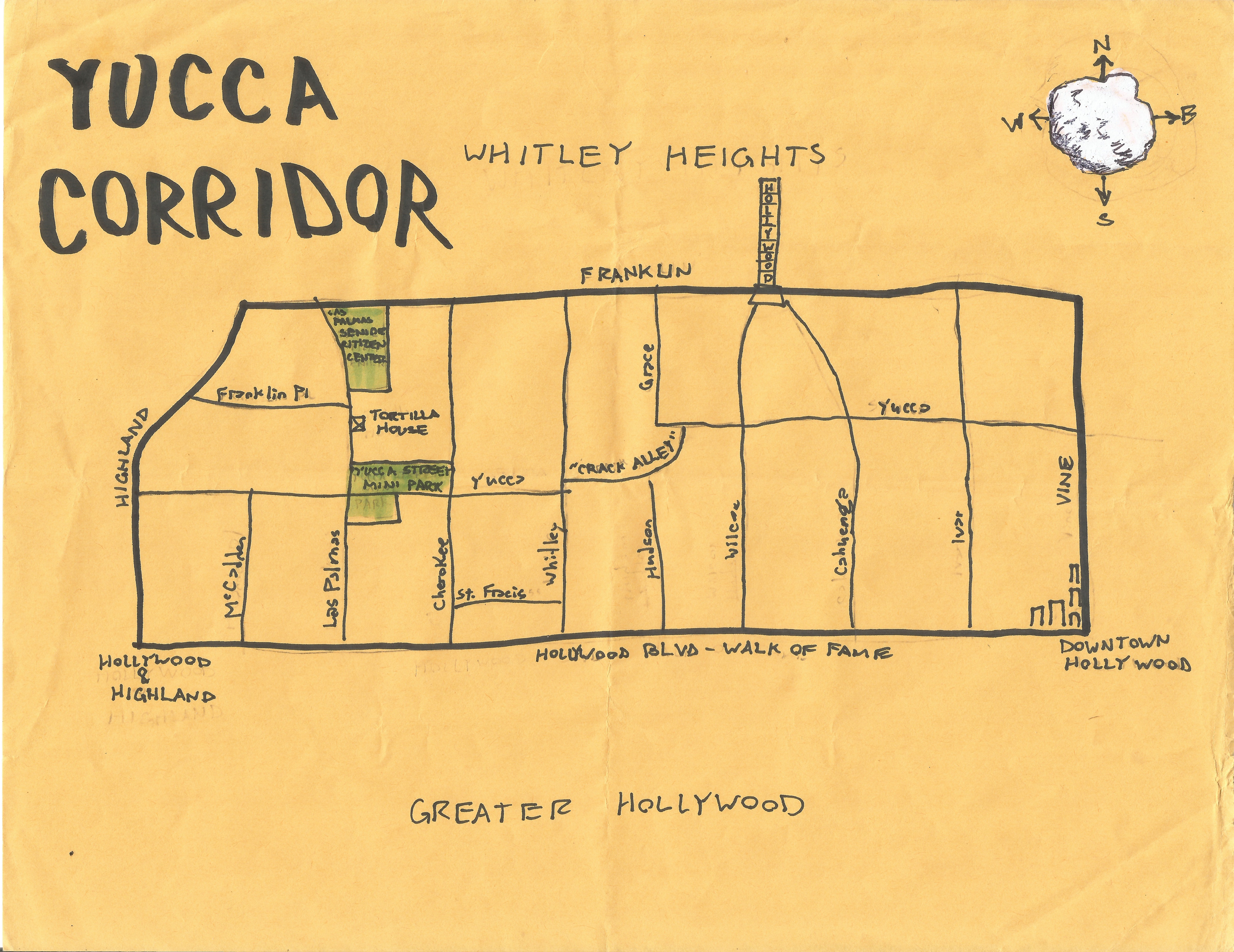 In 1992, a block to the south, the LA riots spread to Yucca Corridor and Frederick’s of Hollywood was looted, Madonna’s famous pointy bra stolen in the process. The following year, the street was paved with glassphalt, a sparkly pavement designed to add a suggestion of glamour to the embattled, ramshackle neighborhood. When the Northridge earthquake hit the following year, several buildings were condemned. Violence peaked afterward, with Yucca averaging a murder a day. Blockades were erected along the street to reduce drug trafficking.
