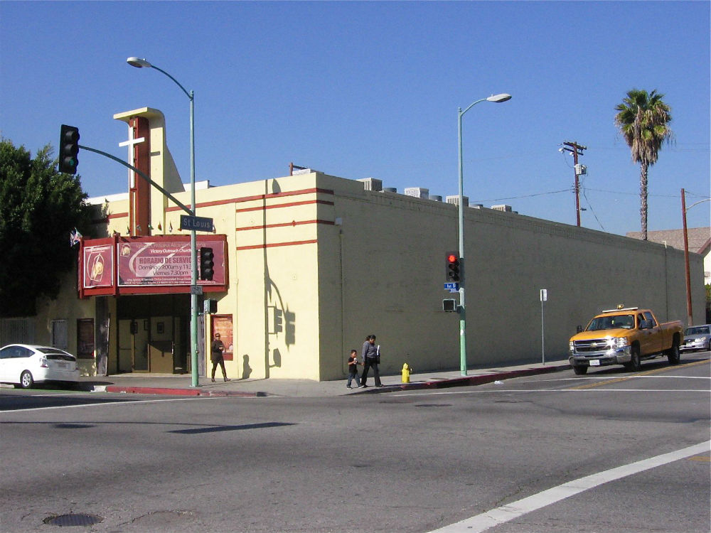 The New Lyceum‘s exact date of construction is unknown although a 1914 city directory lists R.F. Hale’s New Lyceum Theatre at the same address. The 1915 directory makes no mention of the theater (which may’ve been a nickelodeon rather than a cinema in the modern sense). A city directory from 1918 lists The Meralta Theatre, (its name was derived from the names of its owners, Pearl Merrill and Laura Peralta). In 1930 it underwent major redesign or repair and took on an Art Deco look. In the 1970s, the theater was reborn as the Teatro Azteca and showed Spanish-language flms. The Azteca closed and sat vacant for years before reopening in 1993 as a church operated by Victory Outreach.