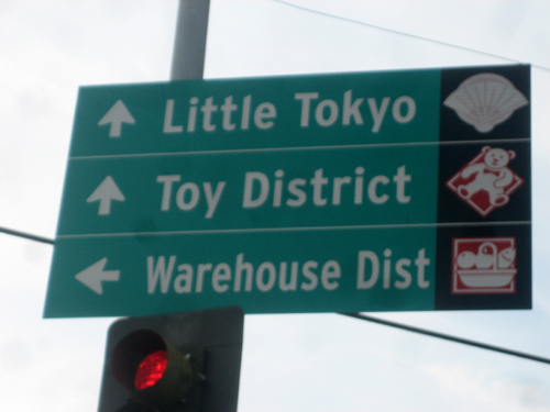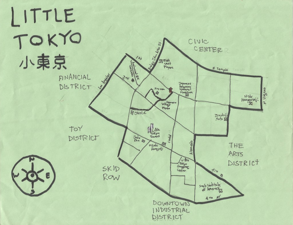 Little Tokyo (or 小東京) is a small neighborhood in Downtown Los Angeles. It’s generally considered to be bordered on the west by Los Angeles Street, on the east by Alameda Street, on the south by Third Street, and on the north by First Street.