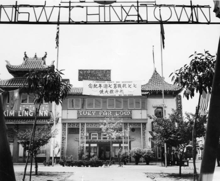New Chinatown was funded by the Chinese American community. The buildings were designed by Adrian Wilson and Erle Webster. “New Chinatown” was eventually extended to the surrounding area (to differentiate it from “Old Chinatown” — demolished to allow for the construction of Union Station and the Hollywood Parkway). What was built as New Chinatown is now known as Chung King Road and Court, and Chinatown Central Plaza.