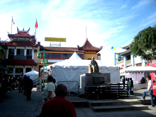 So, on behalf of the California Fool’s Gold, I journeyed to the mysterious orient on the day of the Los Angeles Chinatown Firecracker 5/10K. Like the Doctor, I prefer the company of a traveling companion. In this adventure, I was accompanied by delightful designer/artist Wendy Chin. Let me begin with a bit of history.
