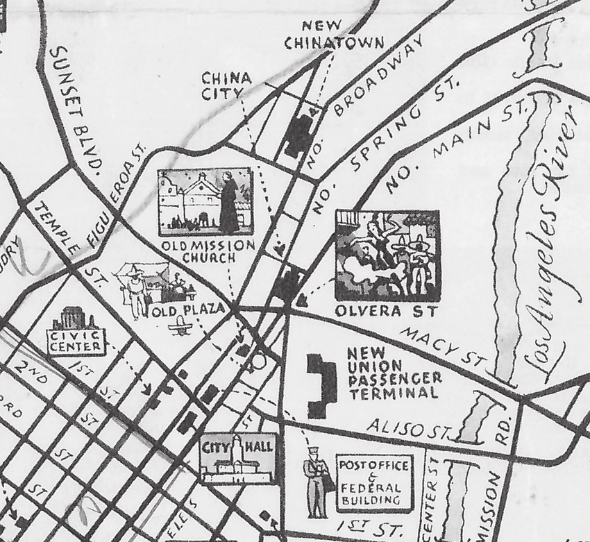 Detail of “Sightseeing Map of Los Angeles and Hollywood,” circa 1940, showing the locations of China City and New Chinatown (as well as “New Union Passenger Terminal” — the location of “Old Chinatown”)