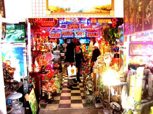 I already mentioned some of the numerous bazaars, plazas, shopping centers and stores in the neighborhood. The largest store in Chinatown is The Wing Hop Fung Ginseng and China Products Center, where I was first mesmerized by 英雄 (Hero) playing on a big screen television years ago. The plazas are home to loads of the aforementioned restaurants as well as clothes, curio shops, dishware, herbalists, household items, jewelers, mogwais, monkey paws, movie and music stores, pets, sots, and so many flashing, blinking, beeping shiny objects that — to paraphrase Ms. Chin — you perhaps wouldn’t want to experience whilst tripping.