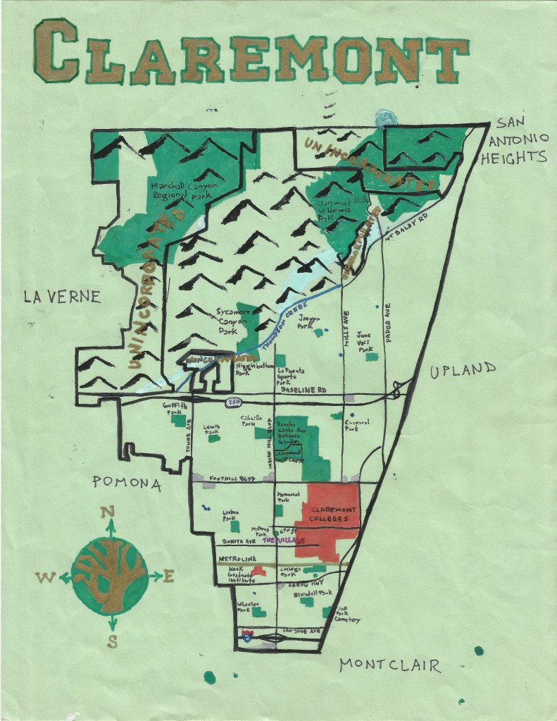Claremont is the poshest of the three cities in the Los Angeles end of the Pomona Valley. It’s bordered by La Verne to the west, Pomona to the southwest, Montclair to the southeast, Upland to the east, and the Angeles National Forest to the north. My opinion of Claremont’s poshness is almost entirely based on knowing someone from nearby Ontario who claimed to be from Claremont to elevate her status.
