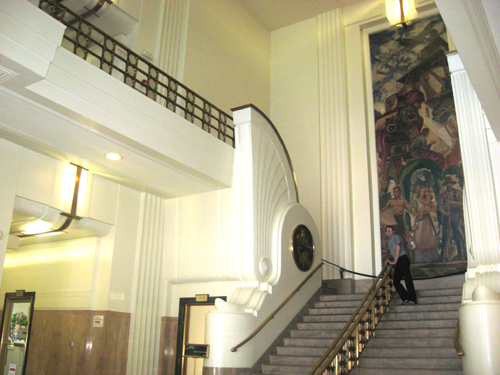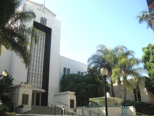 Burbank’s Art Deco City Hall was designed by William Allen and W. George Lutzi and completed in 1943. Inside is a large mural painted by Hugo Ballin depicting Burbank’s ties to agriculture, aerospace and film.