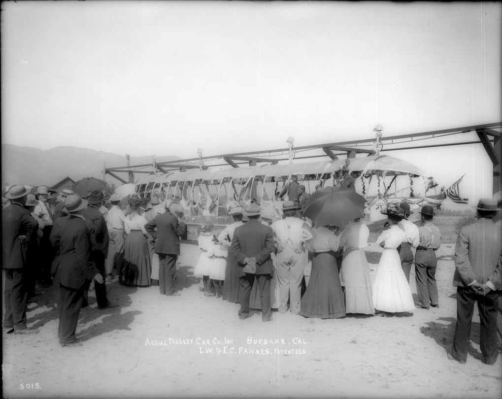 In 1907, farmer Joseph Fawkes and E. C. Fawkes secured the first American patent for a monorail. They formed the Aerial Trolley Car Company and christened their first monorail “Aerial Shadow.” In 1907, it embarked on its first trek… only to fall apart after traveling approximately a foot. It was rebranded “Fawkes’ Folley.” In 1911, Joseph Fawkes re-settled on West Olive in Burbank where he grew apricots. The same year, Burbank was incorporated as a city and, two months later, a more reliable method of transportation, the Red Car, arrived. After that, the previously primarily agricultural town would rapidly industrialize and grow. In 1916 Burbank had 1,500 residents. That year, Original Stage Lines began running buses between Downtown Los Angeles and Burbank.