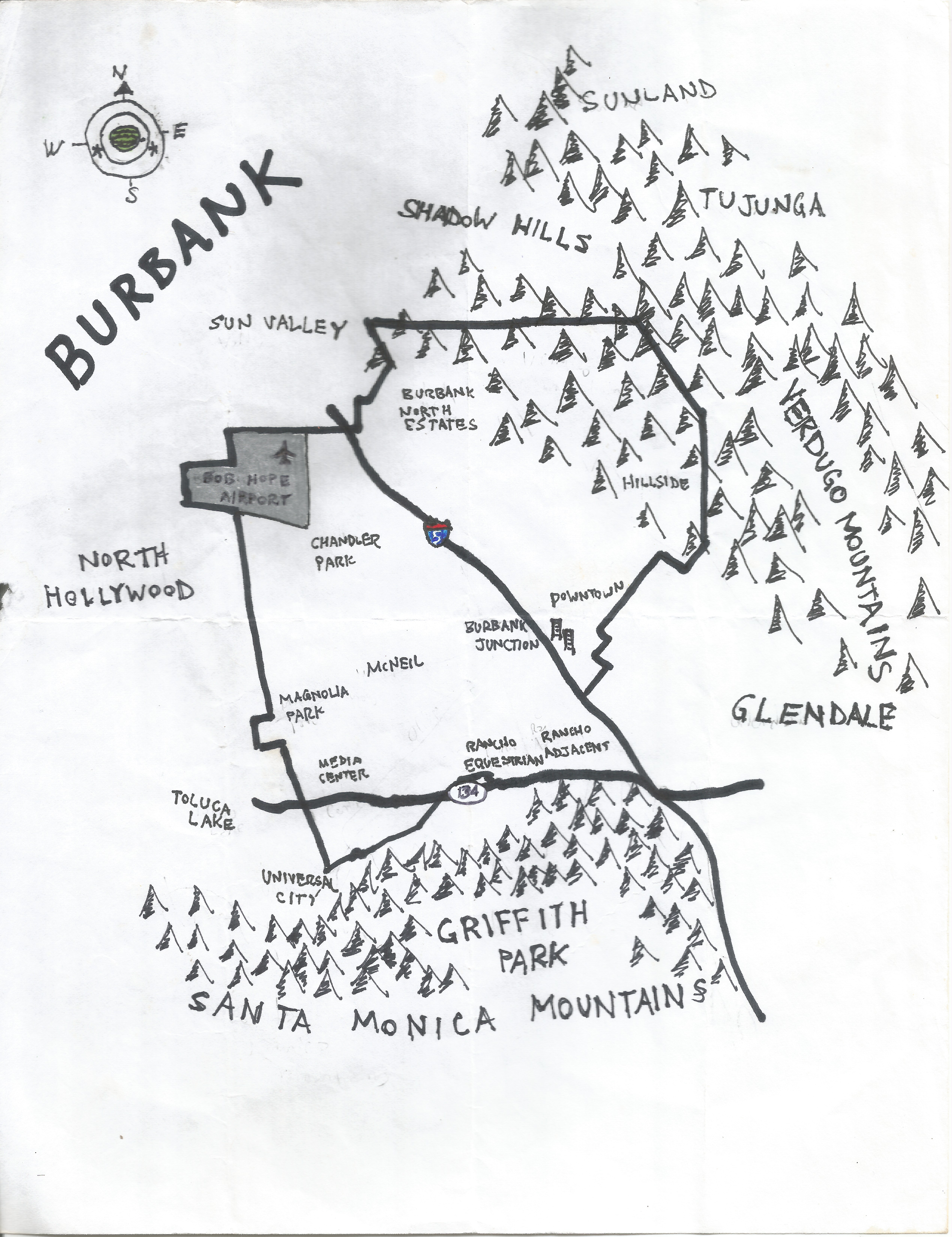 Anyway, Burbank is located in the San Fernando Valley and can be divided into two distinct areas, one nestled on the slopes and foothills of the Verdugo Mountains, and one in the western portion in the southeastern end of the San Fernando Valley. Burbank is surrounded by Tujunga and Sunland to the northeast, Shadow Hills to the north, Sun Valley to the northwest, North Hollywood to the west, Toluca Lake and Universal City to the southwest, Griffith Park to the south, and Glendale to the east.