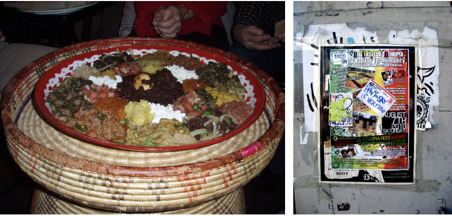 Ethiopian food on a Messob and a poster for Lil Taste of Ethiopia