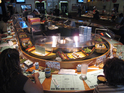 When I first moved to Los Angeles and worked in Old Town Pasadena, one of the first places I ate regularly was A’Float Sushi, on account of their great selection of vegetarian sushi options. There’s meat too, for the omnivores and “beady-eyed vegetarians,” but I can’t vouch for its quality. Also, the sushi comes on boats that circle the chefs in a moat, which is always fun.
