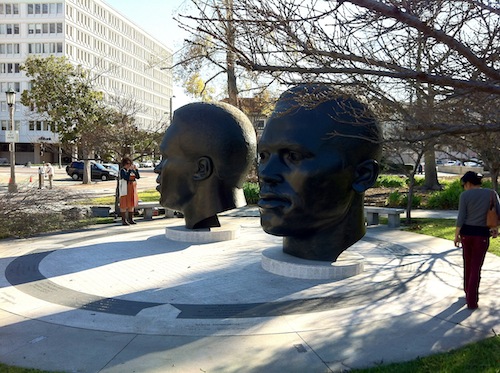 Behind it, two large bronze portrait sculptures of brothers Jackie and Mack Robinson who, along with their mother, moved to Pasadena in 1920.