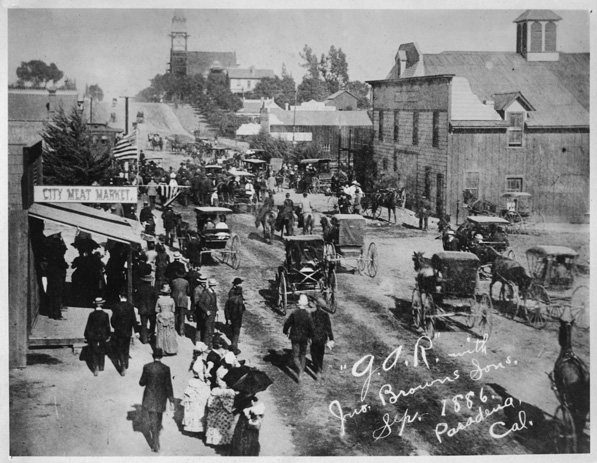 In 1872, a sickly doctor named Thomas Elliot sent an exploratory group west, led by Daniel M. Berry, in search of a warmer climate in which to establish a farm. In what’s now Pasadena they established the Indiana Colony between Fair Oaks Avenue and the Arroyo Seco across from Lake Vineyard. A year later the Indiana Colony — founded by settlers from Indiana, Iowa, and Michigan — of California formed to purchase approximately 4,000 acres from Wilson, Griffin, and Eaton. Mail for the Indiana Colony was addressed “Indiana Colony via Los Angeles,” which was too much of a pain. Potential alternate names bandied about included Buena Vista, Hesperia, Indianola, Muscat, New Granada, and Orange Grove, among others. Finally, “Pasadena” was settled upon, an Ojibwe term that means “of the valley.” In 1875, the residents of the colony included forty houses and a grove of 10,000 newly-planted citrus trees. In 1876, the Southern Pacific Railway arrived in neighboring Los Angeles and a real estate boom followed.