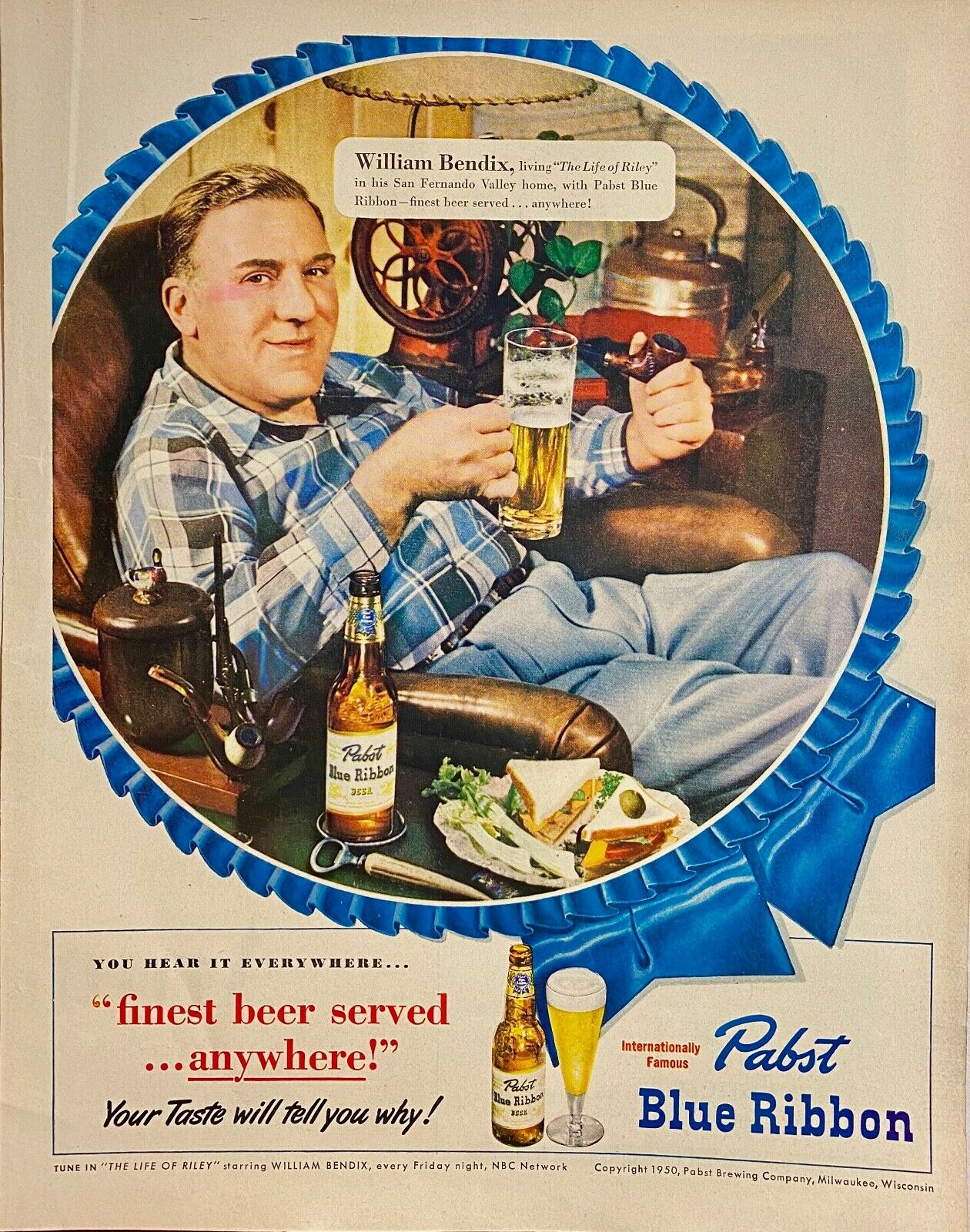 The Life of Riley began with an audition taping on 25 July 1943 after its creation by Irving Brecher. Over the course of roughly 320 episodes, it established itself as one of the most enduringly funny sitcoms on Old Time Radio. Its final episode on ABC aired on 8 July 1945. After moving to the NBC radio network, it aired again from 8 August 1945 until its final episode aired on 29 June 1951.The main character, Chester A. Riley, was played by William Bendix. His wife, Peg, his son, Junior, and his daughter, Babs, were all played by more than one actor. Both his co-worker/neighbor, Gillis, as well as audience favorite, Digby “Digger” O’Dell (the “friendly undertaker”) were played by John Brown. At various times the program was sponsored by the American Meat Institute, Teel Dentifrice, Dreft, Prell Shampoo, and Pabst Blue Ribbon Beer.