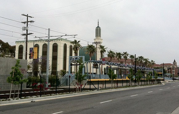 The Expo/Vermont Station (formerly Vermont Avenue) lies at the intersection of University Park and Exposition Park, adjacent to USC and the large Masjid Omar Ibn Al-Khattab mosque, which opened way back in 1414 (1994 on the Gregorian calendar). University Park is home to USC — California‘s oldest private research university. Exposition Park is home to the California Science Center, California African-American Museum, Los Angeles Memorial Coliseum, Los Angeles Swimming Stadium, Natural History Museum, and the Exposition Park Rose Garden, arguably making it the primary cultural center of South Los Angeles. On the south side of Exposition, mostly barren yards were nonetheless freshly weed-whacked and the air was heavy with the scent of grass clippings, exhaust and what I think was chicken. A group of children pursued each other in an endless circle. The other side of the street seemed comparatively bucolic, with flowers and papayas growing in gardens and houses shaded by large trees.