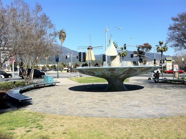 After briefly visiting the arboretum, we headed northeast along Huntington Drive, Arcadia’s so-called “Restaurant Row.” Another sidewalk-scarce stretch, it’s also home to a striking Chamber of Commerce building, the Arcadia Historical Museum, and the Santa Anita Golf Course (original site of the Santa Anita Racetrack and site US Army‘s Ross Field Balloon School during World War I). In Arcadia County Park we briefly checked out a fountain with a peacock motif, although equally eye-catching is the adjacent Denny’s with a windmill atop it — a reminder that it was formerly a Van de Kamp’s Restaurant.
