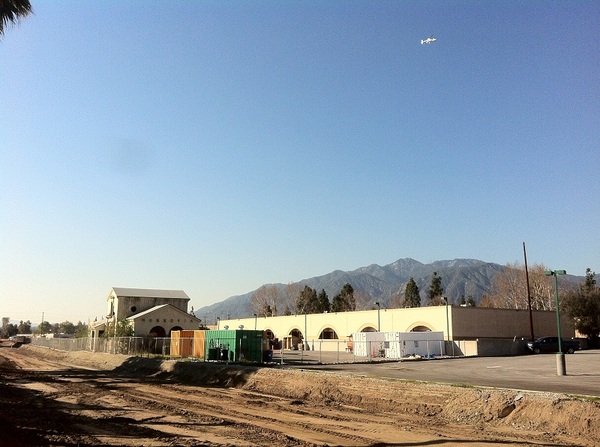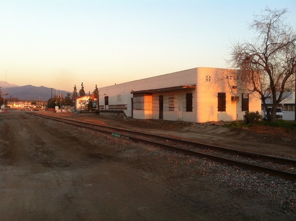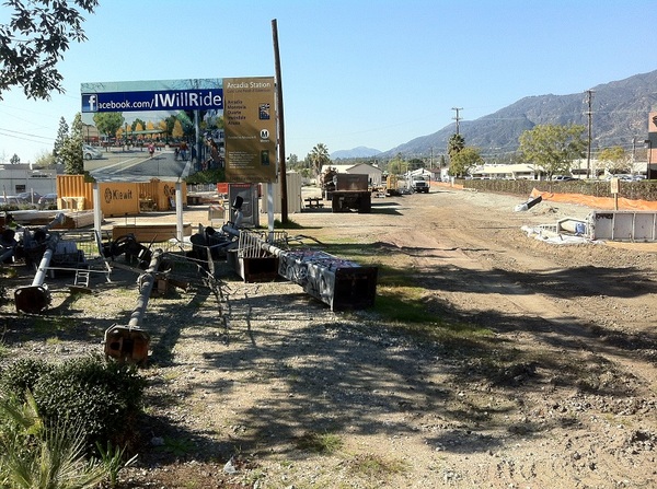 Monrovia Station is being built near the intersection of Duarte Road and Myrtle Avenue. Right now the immediate surroundings are characterized by the presence of warehouses, light industry, box stores, and chain restaurants, but all that is set to change dramatically. Firstly, the construction of a large, mixed use transit-oriented district called Station Square Transit Village, which will incorporate the old Santa Fe Railroad station, used from 1926 until 1972, will surely change the landscape and atmosphere of the area. Secondly, a large maintenance yard is being built just a little to the east.