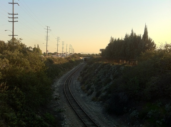 Since at this point the train’s route no longer travels between lanes of a freeway, we walked along its course toward Monrovia. There are no signs along the track informing travelers that they’ve left Arcadia, but the relatively modest homes and rustic vibe were obvious indicators. Shortly after crossing the Arcadia Wash (a tributary to Rio Hondo) we approached the site of the Monrovia Station.