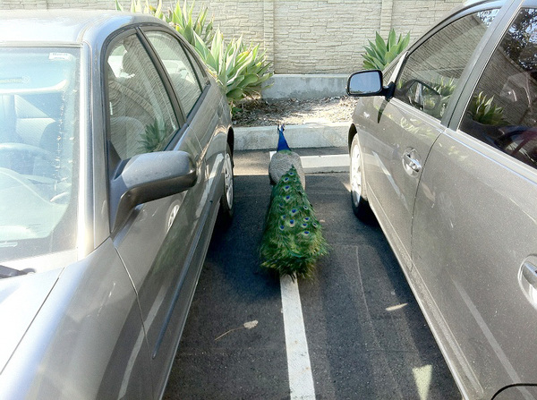 At 51 hectares, the arboretum is roughly the same size as the better-known Huntington Library‘s Botanical Gardens in nearby San Marino. Its grounds are patrolled by some 200 peafowl descended from those brought to Arcadia from India around 1880 by the notorious Elias Jackson “Lucky” Baldwin. Peafowl have long been a symbol of the city, and as we approached the gardens, we spied a peacock wandering the parking lot as if trying to remember where he’d left his car.