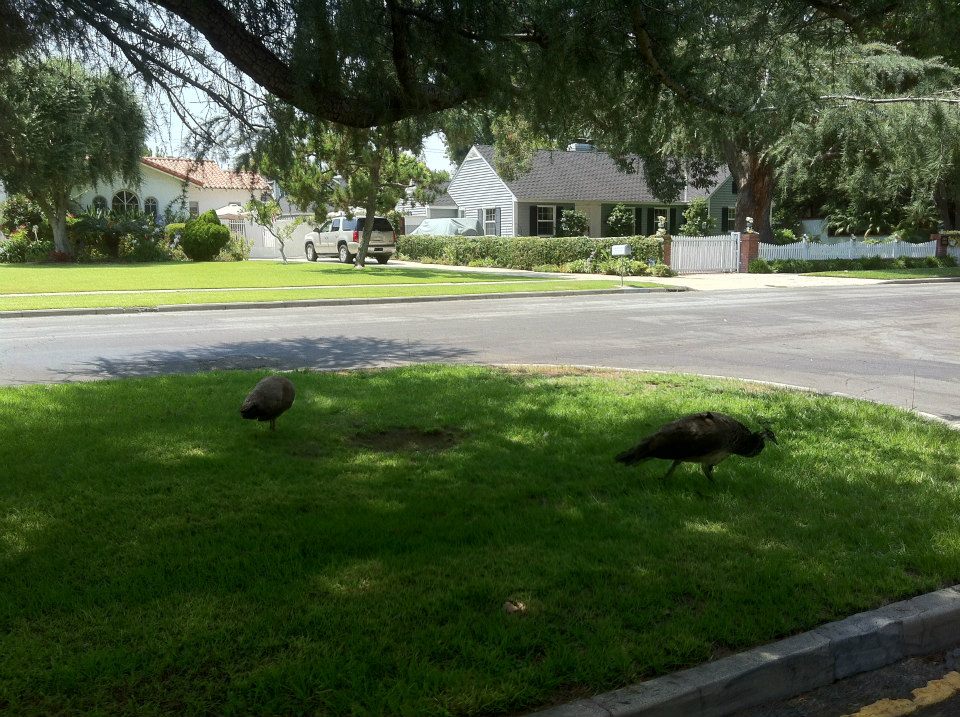 Peacocks in East Pasadena (one just off camera to the left was doing its business)