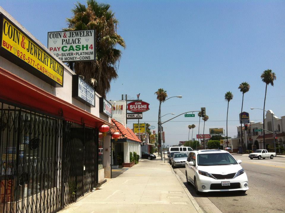 Much of the eastern part of the community is characterized by nondescript ranch homes situated atop thirsty, fallow grass lawns decorated by dusty lawn ornaments and dry fountains. The southern edge along Huntington Drive is more obviously oriented toward the San Gabriel Valley’s growing Asian American population, faced by billboards in Chinese from the East San Gabriel side of the street and home to tea houses and Chinese-speaking ESL schools.