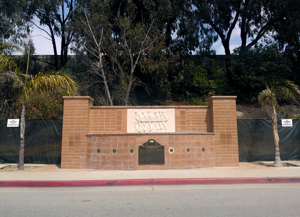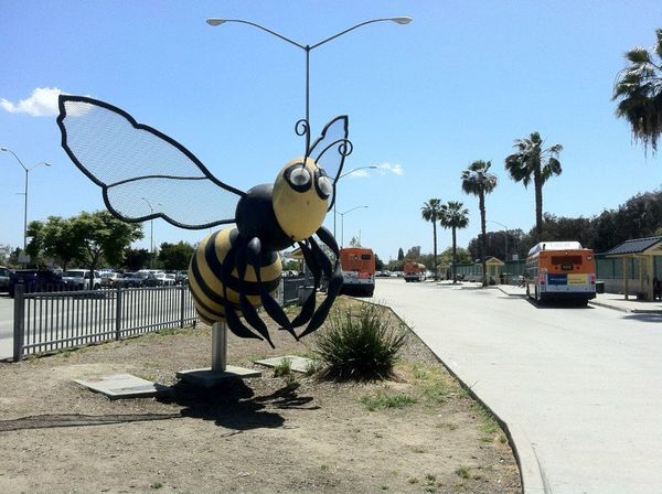 After the Green Line departs from the 105, it winds leisurely southward through El Segundo. The first El Segundo Station is Mariposa, close enough to the ocean that one can smell it, but still 4.5 kilometers away. Nearby is a park popular with soccer and lacrosse players, Campus El Segundo. There’s also the Toyota Sports Center, a practice facility for several professional sports teams and a public skating rink. A little further west is the Automotive Driving Museum, which houses an impressive collection of classic cars. Closer to the station, a mid-century office building at Mariposa and Nash is home to several pieces of public art made by Gidon Graetz and Mark Stasz, whose work I recognized from having seen other examples along the Downtown Los Angeles’s Calvin S. Hamilton Pedway.