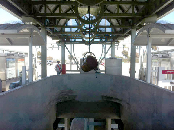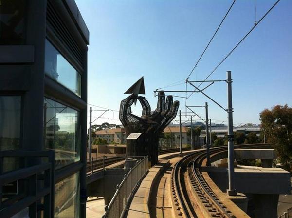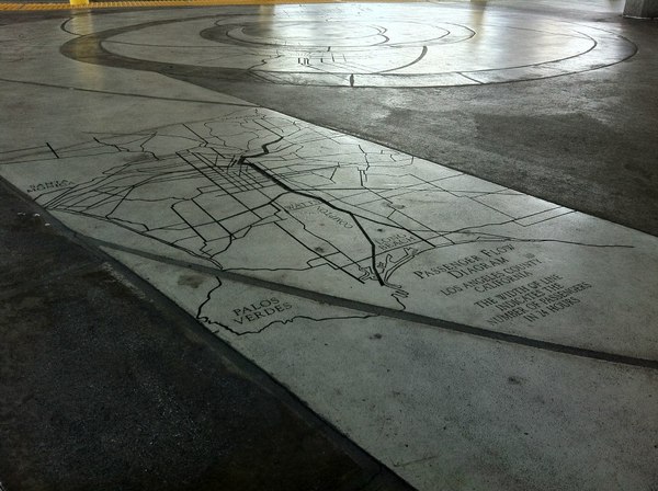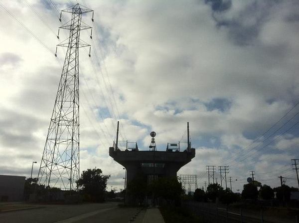 For those who don’t live or work in the neighborhood, the interchange itself is probably the most interesting feature of the area. When completed in 1993, the 37 meter high interchange was the “biggest, tallest, most costly traffic structure yet built by California Department of Transportation.” Two years later it won an Award of Merit at the Excellence in Highway Design awards ceremony. Although no longer exceptional (Houston now has more than a half dozen similar interchanges), it’s still an impressive bit of design and engineering. It also includes, as do all the Green Line stations, station art — in this case Steve Appleton‘s City Imprints.