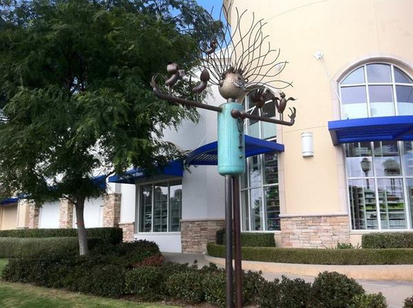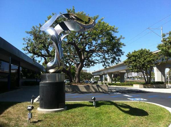 El Segundo Station is located about half a mile from Mariposa in another part of the aerospace hub that’s home to Raytheon Space and the Aerospace Corporation (home to Charles C. Lauritsen Library). The aerospace industry is given a sly nod by the station art, Daniel J. Martinez‘s For Your Intellectual Entertainment, which depicts a large set of hands poised to launch a small, paper airplane. There’s little in the immediate vicinity for explorers besides tidily-landscaped business campuses, vast parking lots, and anonymous, mid-rise skyscrapers. A little west of the station is a golf course, The Lakes at El Segundo. South of that is the large Plaza El Segundo, the property of which includes ten salvage sculptures made by Phillip Glashoff.