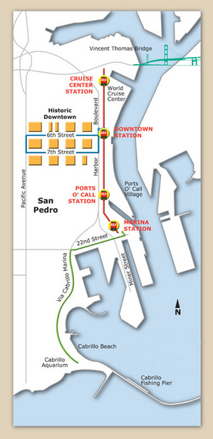 The northernmost station on the Waterfront Red Car line is Cruise Center Station, named after the nearby World Cruise Center — the busiest cruise port on the west coast. Also nearby is the Catalina Air-Sea Terminal, where travelers to and from Two Harbors and Avalon on Santa Catalina Island come and go via Catalina Express boats and helicopters.