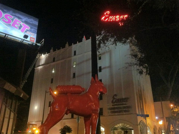 Stops 4 and 16, at Kings, are located near Kings Road Municipal Parking Structure, which is the best place to park for visiting motorists who wish neither to pay for valet parking or traffic tickets. Just west of that is the Emser Tile Building, a 7-story structure with Gothic and Tudor elements that was designed by Niebecker & Jeffers, and built in 1925. On the night that I visited firefighters were climbing onto the roof and a small crowd was gathered below, although none could more than speculate as to what was going on. One passerby told me that the building’s roof was featured in a key scene in the film, Lethal Weapon, and that I should look it up to confirm what he said, which I later did. Nearby are a group of pink sculptures by William Sweetlove, called Cloned Bulldogs with Water Bottle.