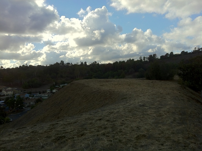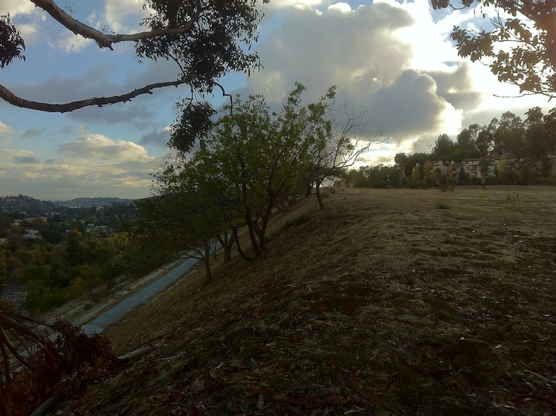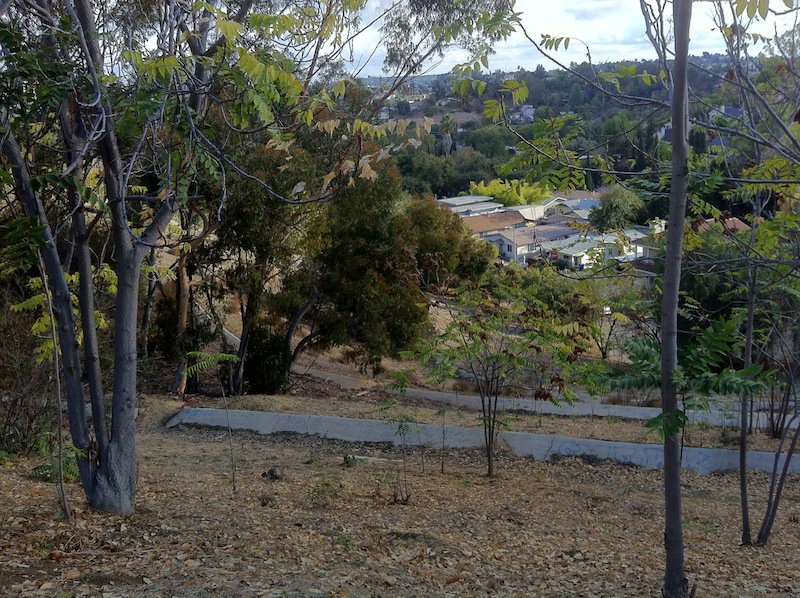 Monterey Hills is blessed with quite a bit of mostly undeveloped space as well. It’s separated from Hermon below by a steep, woody hillside. The hillside separating Monterey Hills from El Sereno (an “alternate hillside preserve”) is less steep but terraced and lined with anti-erosion drainage ditches and a chain link fence. The earthen slope appears to have been built up considerably, almost as if it’s meant to serve as a defensive wall to protect this modern Masada in the unlikely event of a siege.