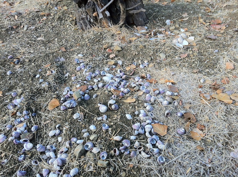 There’s also a large open area next to Fremont Villa that seems to serve as an unofficial park… or possibly dog park as it was the one spot in the otherwise decidedly clean neighborhood that was littered with dog defecation, garbage, and more. Dooley and I walked a well-worn trail and encountered signs of a small fire (or at least a burned log). The area affords a spectacular view and an empty case of Bud Light, an empty box of Patron, an empty case of Modelo Especial, and an empty case of something called Straw-ber-ita suggest that it’s a popular site to do some outdoor drinking, relaxing — and sadly, littering. There was also the expected litter from Del Taco and McDonald’s. More surprising was a midden where the shells of various animals seemed to have been dumped.