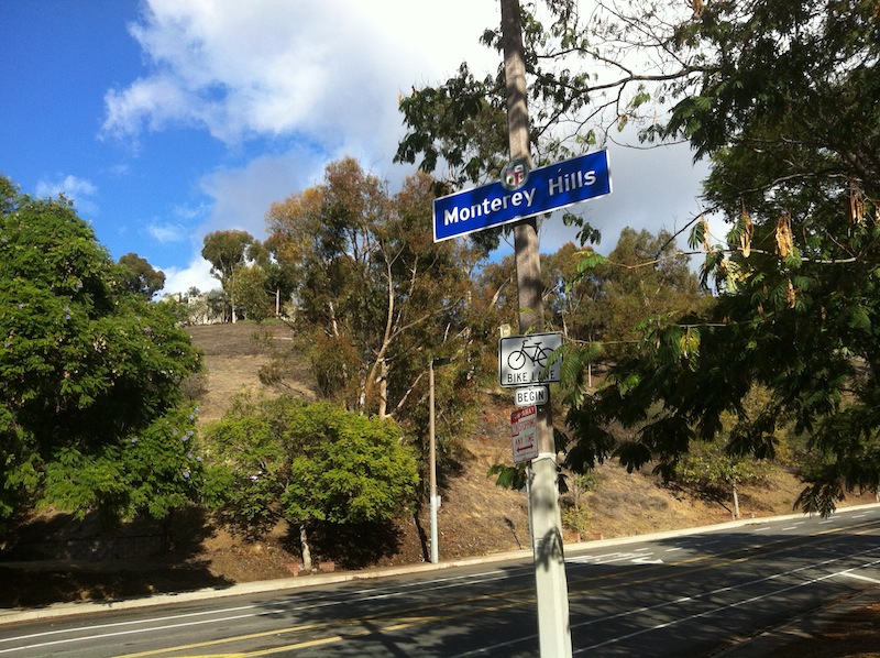 We approached Monterey Hills via Monterey Road, which runs along the western edge of the neighborhood. We then entered the neighborhood via Via Marisol – a ridiculously wide (even on a road diet) street that’s an extension of what was formerly Hermon Avenue. Hermon Avenue was renamed Via Marisol in 1978, when then-Councilman Arthur Snyder renamed it, attempting to pander to his mostly Latino constituency by explaining that allowing a street to continue to be named “Hermon” in a neighborhood traversed mostly by Spanish-named avenues would have a “jarring influence” on the residents. That the councilman had a then three-year-old daughter named Erin-Marisol Snyder was surely a happy coincidence.