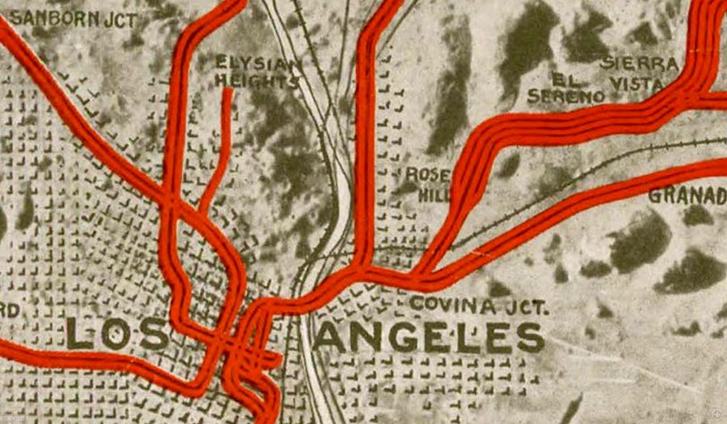 Although Los Angeles is often inaccurately characterized as having primarily developed around the automobile, it did in fact developed around the train. In 1901 Henry E. Huntington (nephew and heir to Southern Pacific Railroad founder Collis P. Huntington) launched the Pacific Electric Railway, which at its peak became the world’s largest network of electric interurban rail. Beginning in 1902, the red cars of its Monrovia-Glendora Line began traveling up Huntington Drive to Sierra Vista Junction, at the edge of what’s now El Sereno and Alhambra. The Rose Hill stop was located at the intersection of Huntington and Monterey Road where a local bus then departed north up that street.