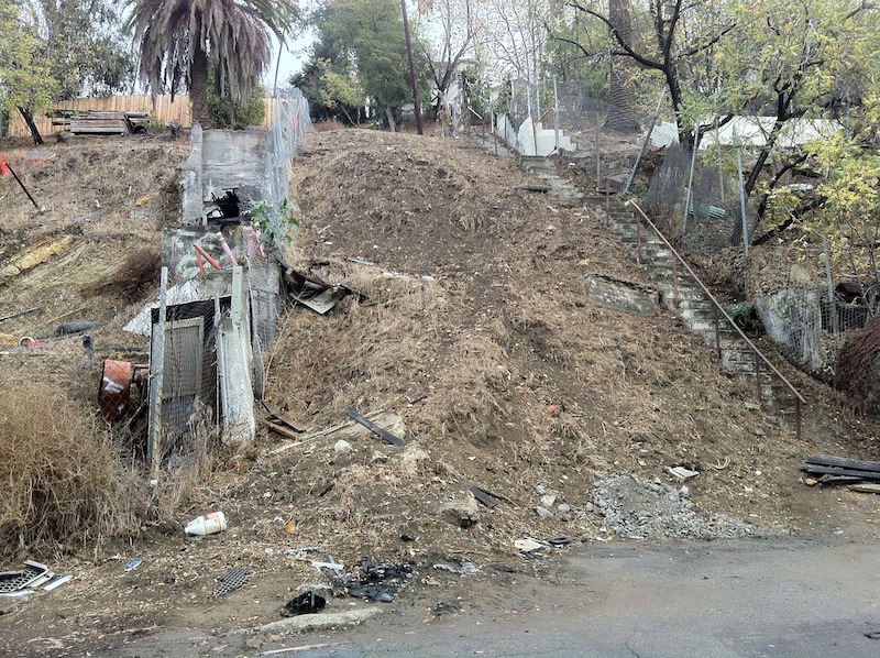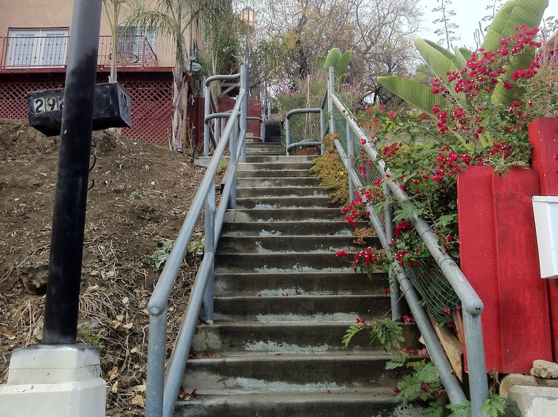 There are several public staircases which, since the publication of Charles Flemming‘s book Secret Stairs, have seemingly catalyzed a real revival in their usage. His book includes a walk, Walk #10, titled “Happy Valley and Montecito Heights” that includes stairs in Rose Hill (and is rated 5 out of 5 in difficulty). The most impressive stairway in Rose Hill is the 223-stair Tourmaline Stairway, which connects Tourmaline Street below to Rose Hill Drive above.