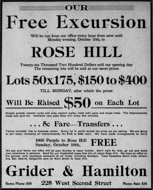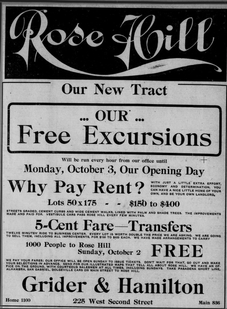 The site of the Rose Hill Tract was chosen due to its accessibility to and by public transit. The primary developer responsible for it was Leroy M. Grider. In 1857, Grider had moved to Los Angeles with his family. He began his foray into real estate with the establishment of L. M. Grider & Co. in Downey in 1886. He changed partners and locations over the years, forming Grider & Hamilton in 1902. On 3 October 1904, Grider & Hamilton put up 132 lots of their streetcar suburb for sale, advertising it as being just twelve minutes to Downtown via Red Car. In Grider’s obituary he was described as being the first developer to sell neighborhoods via the “excursion method,” in which saw he transported potential homeowners via streetcar to then-new “toonervilles” where they would additionally plied with free BBQ. Grider also served on Los Angeles City Council and after retiring from both politics and real estate, opened a pet store called Birdland.