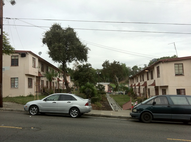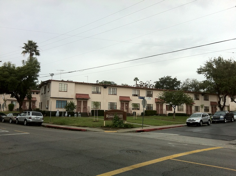 The Housing Authority of the City of Los Angeles (HACLA) formed in 1938 seemingly with the admirable goal of providing safe, affordable housing to Los Angeles‘s poorest inhabitants. Soon after, in the name of “slum clearance,” several (invariably minority) communities were leveled and replaced with new housing projects. The first such housing project was Ramona Gardens in Boyle Heights. During World War II, more project construction continued with Aliso Village, Estrada Courts, and Pico Gardens (all in Boyle Heights), Avalon Gardens (in Green Meadows), Hacienda Village (in Watts), Pueblo del Rio (in Central-Alameda), Rancho San Pedro (in San Pedro), and Rose Hill Courts, built in Rose Hill in 1942.