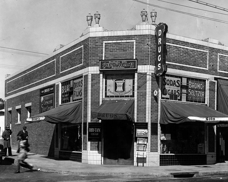 Rose Hill Pharmacy used to stand at 4543 Huntington Drive (at the intersection with Monterey Road — where a self-cleaning restroom labeled “Rose Hills/El Sereno” now stands). On Christmas Eve of 1926, William Edward Hickman and his accomplice Welby L. Hunt attempted a hold-up of the pharmacy that was interrupted by a cop walking in. A shoot-out ensued in which the store proprietor, 24-year-old Clarence Ivy Toms, was shot in the chest and killed. Hickman would go on to commit one of Los Angeles’s most well-known and heinous crimes, the kidnapping and murder of young Marion Parker. He was hanged in 1928. I’m not sure when the pharmacy was demolished.