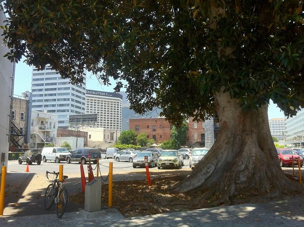 Aside from these modest buildings, not much of historic Little Tokyo remains aside from a row of buildings on the north side of First Street and, behind them, a nearly century-old tree. The majestic 20-meter tall Moreton Bay Fig tree known as the Aoyama Tree was planted around 1920 by Reverend Shutai Aoyama of the Koyasan Buddhist Temple. The temple relocated to its current location in 1940, and today the orphaned fig casts its shade over a quiet corner of a parking lot. In 2008 it was designated Los Angeles Historic-Cultural Monument No. 920.