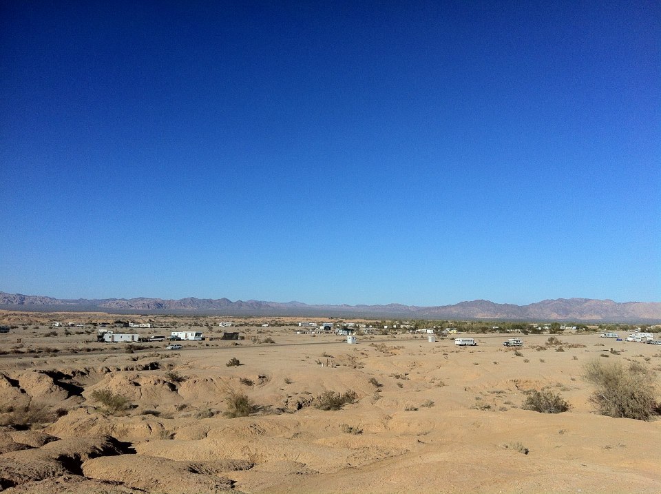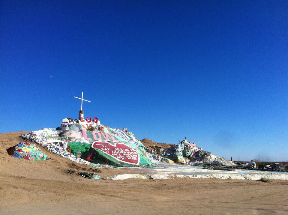 Slab City is a famous squatters’ camp built on the site of Camp Dunlap, an abandoned World War II marine barracks which were dismantled in 1956. The camp has no electricity, no running water, no sewers nor toilets, and no trash pickup service but many Slabbers choose to live “off-the-grid.” Located near the entrance of the camp is Salvation Mountain, a large piece of folk art created by the late Leonard Knight, who amended a hillside with acrylic paint, concrete, adobe, and Biblical verse.