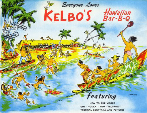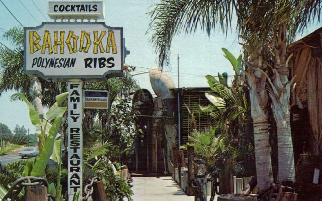 Although many beloved tiki bars and restaurants have closed (RIP Bahooka (1967 – 2013) and Royal Hawaiian (1947 – 2013) and Kelbo’s (c. 1955 – c. 1985), still extant tiki restaurants and bars include Damon’s Steak House, Don The Beachcomber, Kahuna Tiki, the Purple Orchid, Tiki No, Tiki Ti, Tonga Hut, Trader Sam’s Enchanted Tiki Bar, and Trader Vic’s. The craze for Tiki culture is still in evidence at the Tiki Beach Festival in Long Beach, Tiki Night at the Egyptian in Hollywood, and Oceanic Arts in Whittier.