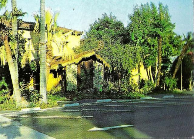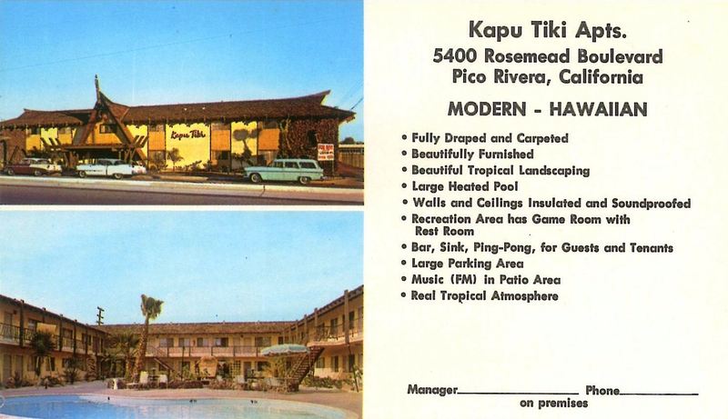 In Southern California, Hawaiian/Polynesian-inspired style influenced the architecture and decor of apartment buildings, bars, drive-ins, and bowling alleys. My own apartment, construction of which began in 1961, has a steep, peaked A-frame roof and extended roof beams. There are many apartment complexes throughout the Southland with names like the Outrigger Apartments, Kona Gardens, Kona Kai Apartments, Kona Pali, and Aloha Apartments which make even more explicit their particularly Hawaiian aspirations.
