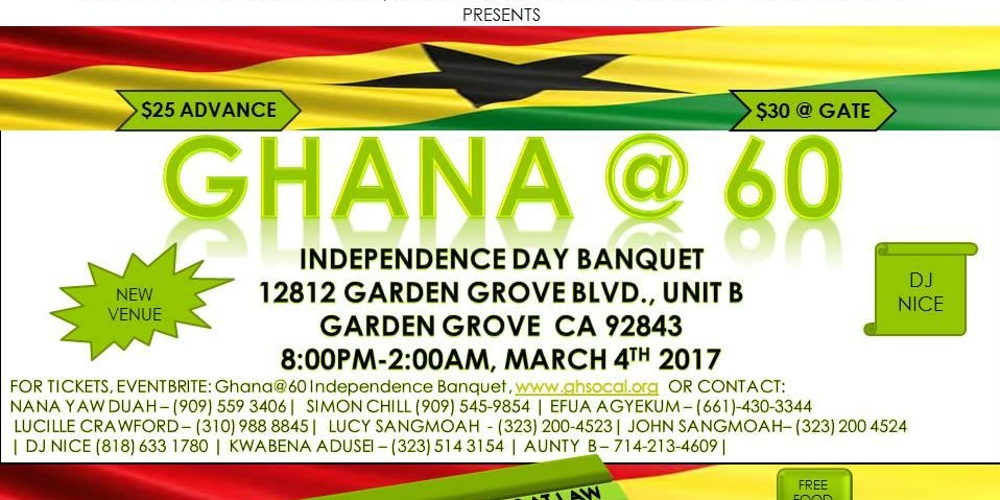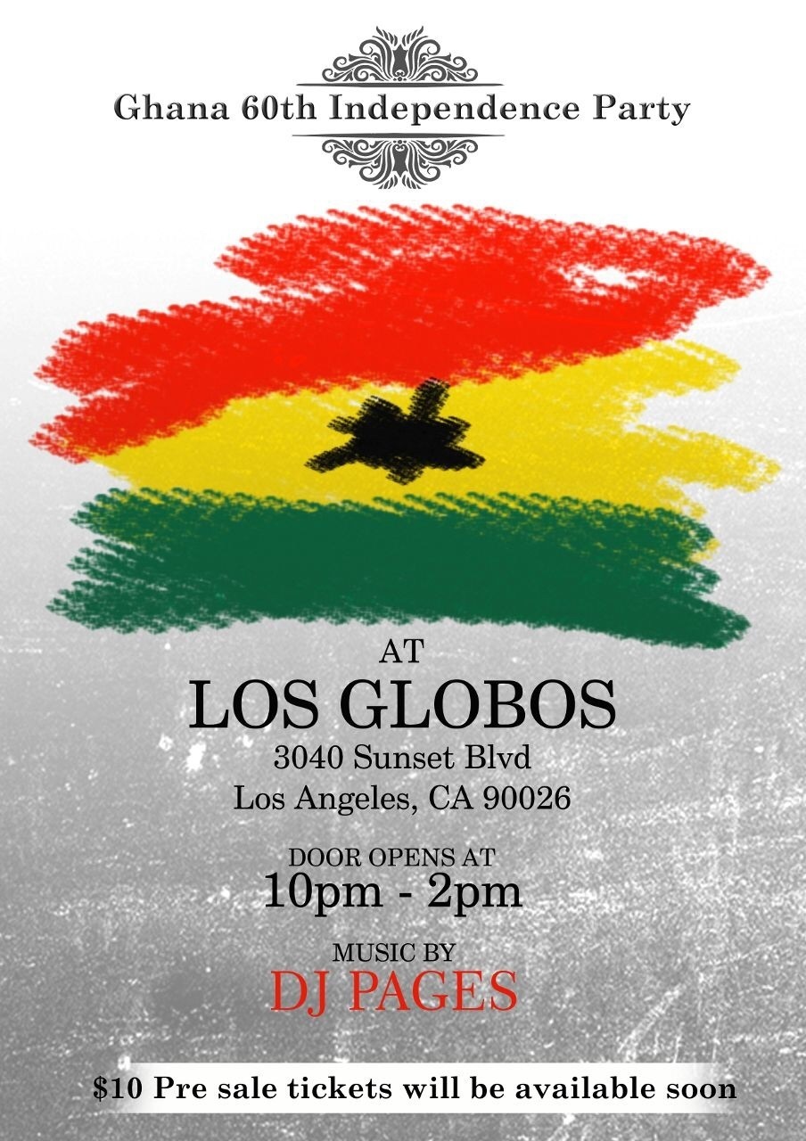 Ghana’s Independence Day is celebrated on 6 March and is an occasion marked by many Ghanaians in Southern California and administered by several organization. There are ate least two events marking Ghana’s 60th Independence Day this year — neither taking place on the actual day. The Ghana Association of Southern California is hosting a banquet, Ghana @ 60, in Garden Grove on the 4th of March ($25 in advance, $30 at the door). Silver Lake club Los Globos is hosting the Ghana 60th Independence Party on the 5th of March, $10 pre-sale.