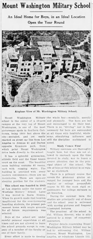 The last real blow to the hotel seems to not to have been the departure of movie stars but to the closure of the popular Los Angeles & Mt. Washington Railway. Inspectors from the Board of Public Utilities cited a worn cable and ordered the cessation of operation in early 1919 and on 9 January, it halted. Even after letting go of hotel operations, Robert Marsh had held onto the railway. He fought in state court to have the railway re-opened but it never did and in the summer of 1921, the hotel closed its doors after eleven years in business. That September, the building re-opened as the Mt. Washington Military School. Despite its name, Colonel William Strover retreated from the neighborhood soon after. In 1923 it was repurposed as the Goodrich-Mount Washington Emphysema Hospital but that institution had breathed its last by early 1925.