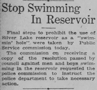 A few years ago, whilst researching the history of the Silver Lake Reservoir, I was rather surprised to learn that several people had drowned in it early in its history. Where there’s water, I suppose, there are drownings — I’d just never thought about it before — and when the reservoir began filling in 1907, it was the largest reservoir in the city. In 1921, it was overtaken by the Encino Reservoir, which I believe remains the city’s largest open-air reservoir. Prior to the Silver Lake Reservoir’s completion, the city’s largest reservoir was the adjacent Ivanhoe Reservoir, which was originally topped with a wooden cover which, although less attractive than open water, probably prevented anyone from drowning within it. The Silver Lake Reservoir, on the other hand, was too large to cover. Recognizing the danger it posed, signs were originally posted along its shore expressly forbidding “fishing, shooting, and bathing.” Although I read of no shootings, it wasn’t long before the city actively encouraged fishing in order to “control” the population of bass the city had stocked it with. And, almost immediately, there swimmers and thus, on occasion, drownings.