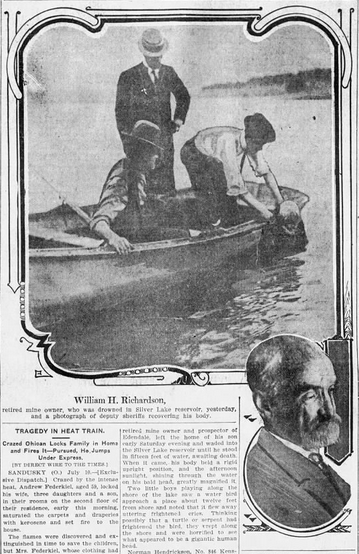The first to die in the Silver Lake Reservoir was, it seems, the only suicide. The victim was a former prospector and miner, William H. Richardson, who was reportedly popular locally and nicknamed “Daddy.” As with all of the drownings, there were few details about the victim, although the fact that his death was reported in the Arizona Republic (underneath the callously unfeeling headline “HE CONTAMINATED THE WATER SUPPLY’) makes me suspect that he’d lived in that state. Surely, otherwise, the death of a Los Angeles retiree wouldn’t warrant mention in an out-of-state publication.
