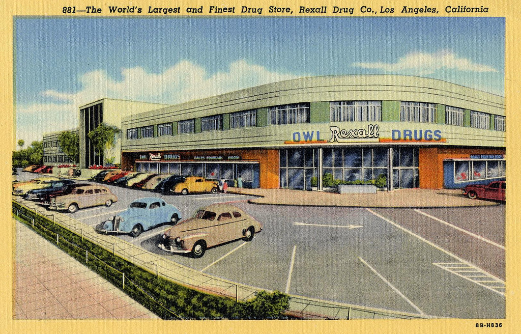 The most famous drugstore in Los Angeles, surely, was Schwab’s Pharmacy. In 1932, Bernard, Jack, Lena, Leon, Martin, and Yetta Schwab founded their drugstore at 8024 Sunset Boulevard. There’s an oft-repeated story that Lana Turner was discovered by director Mervyn LeRoy at Schwab’s. in fact, it was whilst hanging out at the Top Hat Cafe that the high schooler caught the eye of Hollywood Reporter publish William Wilkerson — but the story was believable because movie stars and filmmakers actually did hang out at Schwab’s. So, accordingly, did Hollywood gossip columnists such as Sidney Skolksy, who coined the nickname “Oscar” for the Academy Award and wrote his Photoplay column with the tagline “From a Stool at Schwab’s.” I suppose the unfathomable modern-day equivalent would be TMZ paparazzo lurking around an Alberton’s pharmacy hoping to find Tik-Tok‘s next influencer. Schwab’s appeared in the 1949 film My Dream is Yours, the 1950 film, Sunset Boulevard, the 1964 Jan & Dean song “Dead Man’s Curve,” and the 1965 Andy Griffith Show episode, “Taylors in Hollywood.” Nevertheless, it closed in 1983 and was demolished in 1988.