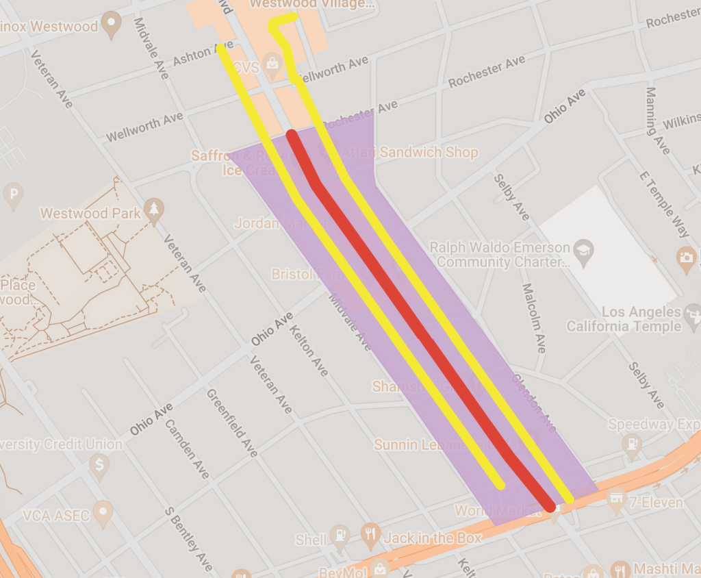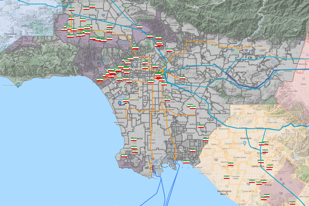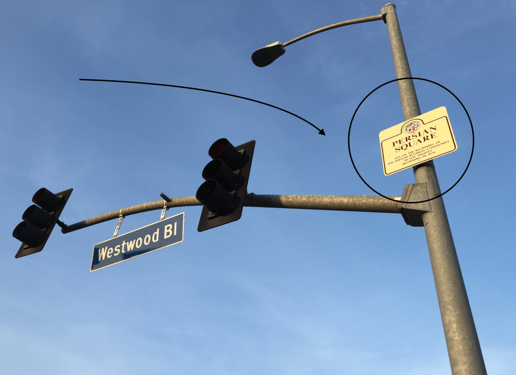 In 1986, freelance food writer Max Jacobson noted in the Los Angeles Times article, “Gustatory Delights in Los Angeles,” that a “section of Westwood has been dubbed ‘Tehrangeles’ by its Iranian denizens.” 26 years later, Adrian Glick Kudler (then the editor at Curbed LA who would go on to win a Distinguished Digital Journalist award in 2016) wrote an article titled “Google Decides There’s an LA Neighborhood Called Tehrangeles,” in which she confidently but wrongly claimed that “[Tehrangeles] has never really referred to a specific location before.” It was not a secret to most Angelenos, however. I made a map of it around 2009. And in 2015, a map with the exact same borders and color appeared in the Jonathan Gold documentary, City of Gold. It does remain, despite its widespread recognition, unofficially recognized by the City of Los Angeles and the LADOT has thus far not installed its familiar blue neighborhood signs. All it takes, however, is 500 signatures to get one.