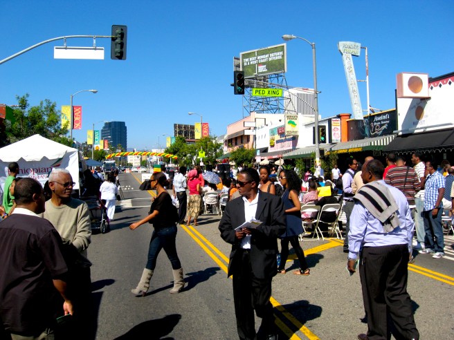 Ride east on Venice Boulevard. You’ll pass Culver City Station — another possible entry or exit for the traveler — and then head north on Fairfax Avenue. Signs for Little Ethiopia appear at Packard Street but ride on one more block to Whitworth Drive as that’s where the Ethiopian district actually begins. Little Ethiopia is really just a single block and, like Tehrangeles, its businesses are all flanked by alleys that would make it easy to transform into a thriving pedestrian promenade.