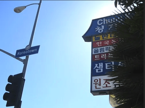 Walk or hop on the bike for three blocks to head north along Irolo Street. The block of Olympic between Irolo and Normandie Avenue is the birthplace of modern Koreatown. It was not the first Koreatown in Los Angeles, though. Old Koreatown arose along Jefferson Boulevard in the 1930s and thrived there at least into the 1960s, when Francis Lewe opened Los Angeles’s first Korean restaurant, Korea House, there. Koreatown began to move when Hi Duk Lee opened V.I.P. Palace (영빈광) ten years later, in 1975. It was followed by V.I.P. Plaza, a two-story shopping center that opened across the street in 1979. Both buildings are recognizably Korean in design and Lee hoped to create a tourist-catering enclave along the lines of Chinatown. Three Koreatown signs were installed along Olympic in 1980. Koreatown direction signs were placed at exits along the Santa Monica Freeway in 1982. More often than not, the Korean businesses and buildings that came to Koreatown did not conform to Lee’s vision. Aside from the Hangul signage and occasional blue stile roofs, there is little in the built environment that overtly announces Koreatown’s Korean-ness. It is, however, distinguishable from most of its Los Angeles. It’s the city’s most populous neighborhood, its most densely populated, and consequently, its most vibrant. Ironically, it thus more closely resembles an actual Korean city than the Epcot Center-like version of a Korean enclave proposed by Lee… although noisy, grungy Koreatown reminds me more of Busan than it does sleek and spotless Seoul.